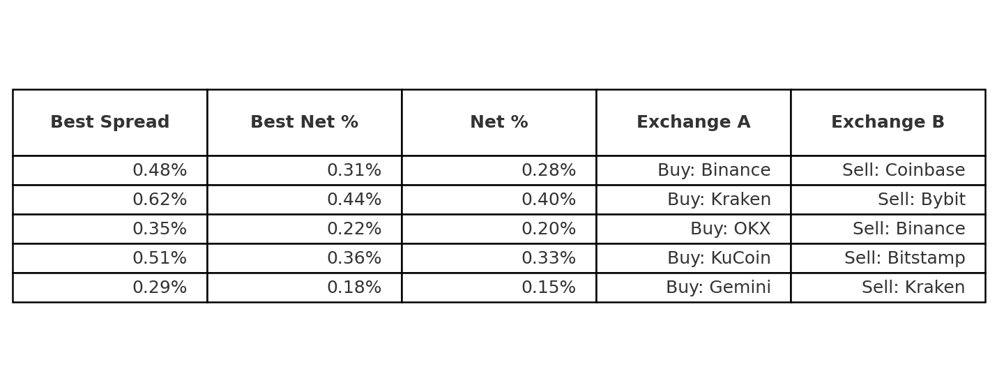 Columns shown: Best Spread, Best Net %, Net %, Exchange A, Exchange B. Pick the lowest Ask as buy venue (A) and the highest Bid as sell venue (B).
